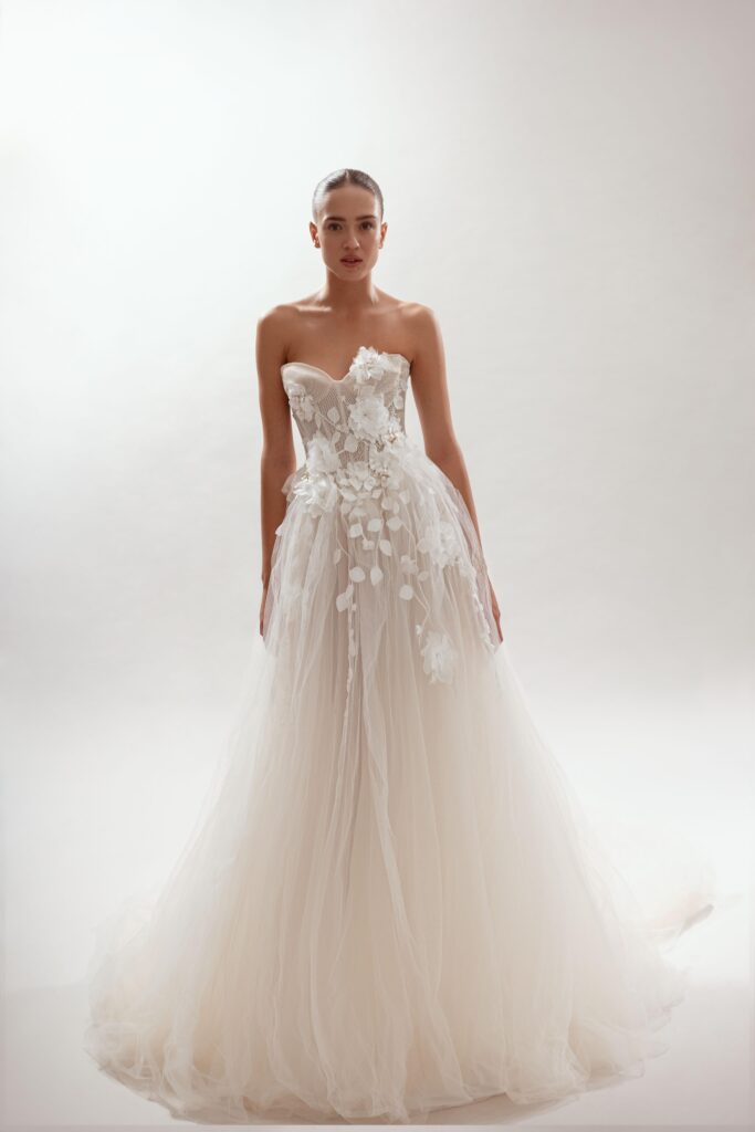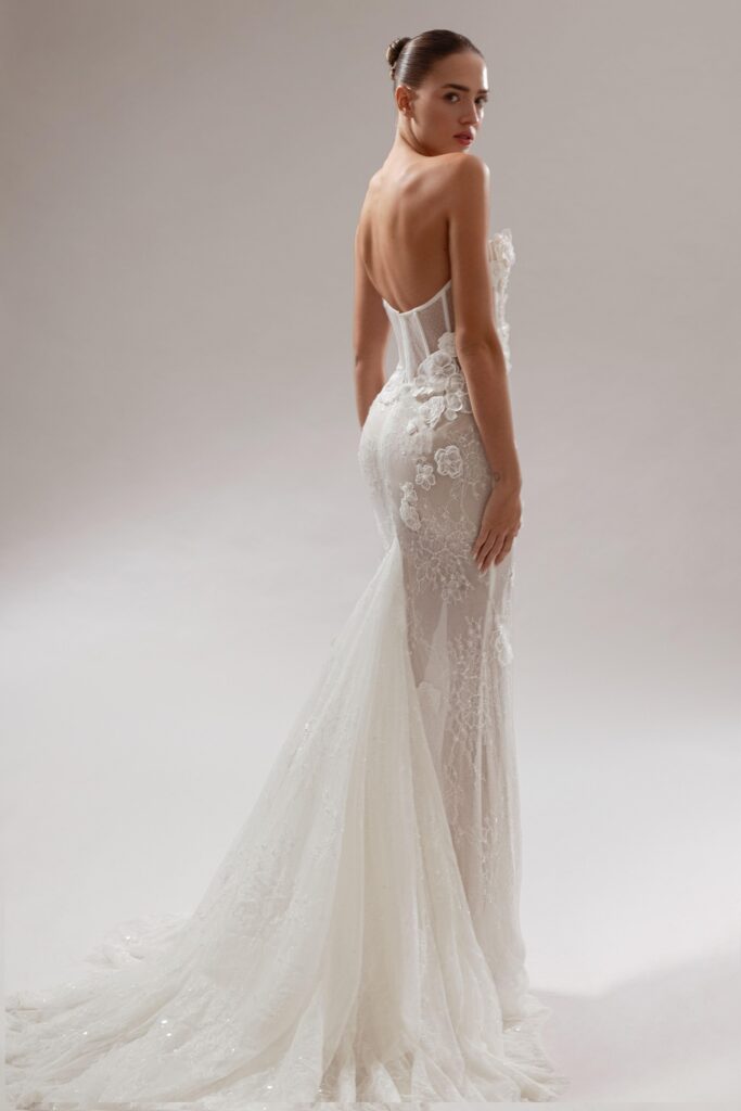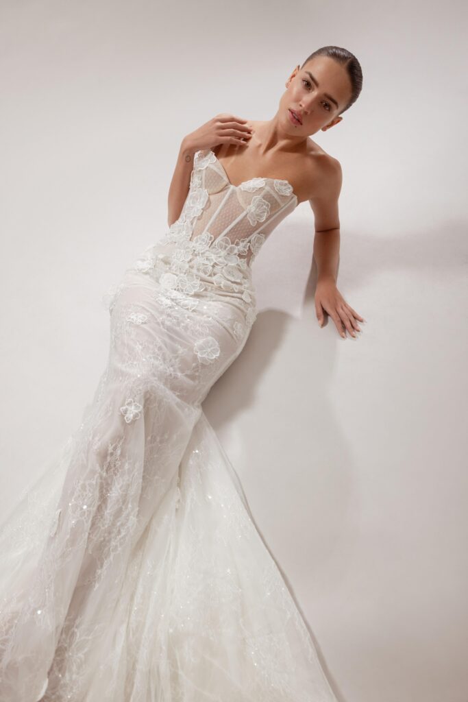 A mermaid gown featuring a strapless straight corset, crafted from sumptuous beaded lace with floral appliqués, complemented by a detachable cape draped over the shoulders.